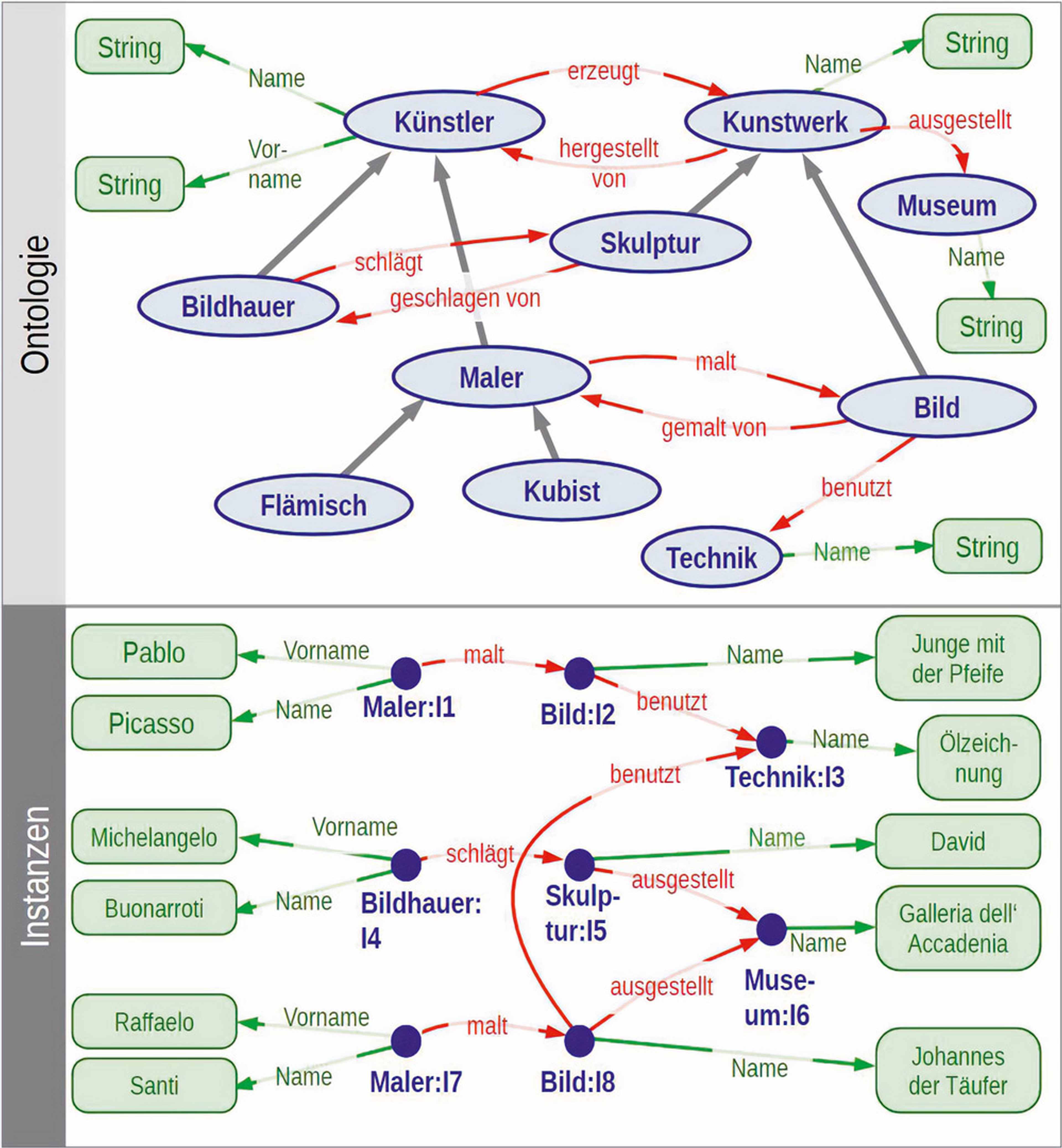 Abbildung 4 zeigt eine Ontologie aus der Domäne „Kunst“ sowie die Anwendung auf Daten. In unserem Forschungsprojekt fokussieren wir uns auf kleine, domänenspezifische Ontologien.