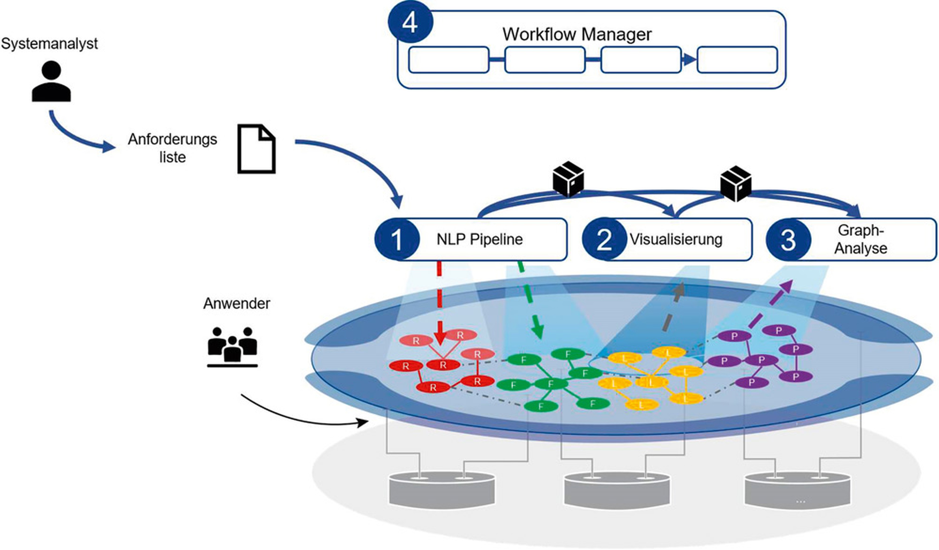 Wie können Systemanalysten diese Möglichkeiten der Analyse nun praktisch nutzen? So wie es integrierte Entwicklungsumgebungen (IDE) für die Softwareentwicklung gibt, brauchen auch Systemanalysen Werkzeuge, um ML-Methoden einfach nutzen zu können. Es gibt bereits KI-Toolkits oder ML-Workbenches und der Markt für derartige Werkzeuge wächst. Im Rahmen des Forschungsprojekts nutzen wir ein Open-Source-Framework, um einen Workflow-Manager zu erstellen. Dies ist eine einfache Weboberfläche, mit der ein Systemanalyst die oben geschilderte Pipeline auf eigene Daten anwenden kann. In dieser Oberfläche können eine oder mehrere derartige Pipelines und Analysen hintereinander- oder parallel gestartet werden. Abbildung 5 stellt dieses Zusammenspiel schematisch dar.
