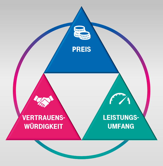 Dieses Bewertungsdreieck aus Preis, Vertrauenswürdigkeit und Leistungsumfang (siehe Abbildung 1) hilft auch in unserem Kontext, um interne und externe Lieferung eines Dienstes strukturierter gegenüberzustellen.