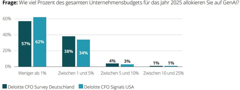GenAI wird insbesondere in wissens und personalintensiven Bereichen ein hohes Potenzial zugeschrieben, dennoch bleiben deutsche Unternehmen bei Investitionen in diese zukunftsträchtige Technologie bisher zögerlich. Das zeigen die Ergebnisse des halbjährlich erscheinenden Deloitte CFO Survey. An der Erhebung nahmen zwischen dem 12. September und dem 2. Oktober 185 Finanzvorstände deutscher Unternehmen teil.