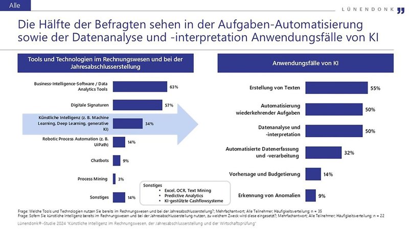 Künstliche Intelligenz (KI) verändert die Art und Weise, wie Unternehmen ihre Prozesse unter anderem im Finanz- und Rechnungswesen organisieren sowie umsetzen. Und sie ermöglicht Wirtschaftsprüfern, mittels des Einsatzes von KI effizienter zu arbeiten. Die neue Lünendonk-Studie „Künstliche Intelligenz im Rechnungswesen, der Jahresabschlusserstellung und der Wirtschaftsprüfung“ in Zusammenarbeit mit RSM Ebner Stolz zeigt, dass mittelständische Unternehmen auf KI-gestützte Lösungen setzen, um die Effizienz zu steigern, Fehler zu reduzieren und komplexe Finanzprozesse zu optimieren. So nutzen bereits 63 Prozent der befragten Unternehmen Business-Intelligence-Software oder Data-Analytics-Tools, um Finanzprozesse zu verbessern. Dabei zeigt sich, dass KI insbesondere in der Automatisierung von Routinetätigkeiten, wie der Belegerkennung, der automatisierten Datenerfassung und Datenverarbeitung sowie der Texterstellung, eingesetzt wird. „Fast die Hälfte der Unternehmen plant, in den kommenden zwei Jahren verstärkt auf KI-Technologien zu setzen“, so Studienautor und Lünendonk-Geschäftsführer Jörg Hossenfelder. „Damit wollen sie sich den wachsenden Anforderungen des Marktes stellen sowie gleichzeitig Effizienzpotenziale heben.“
