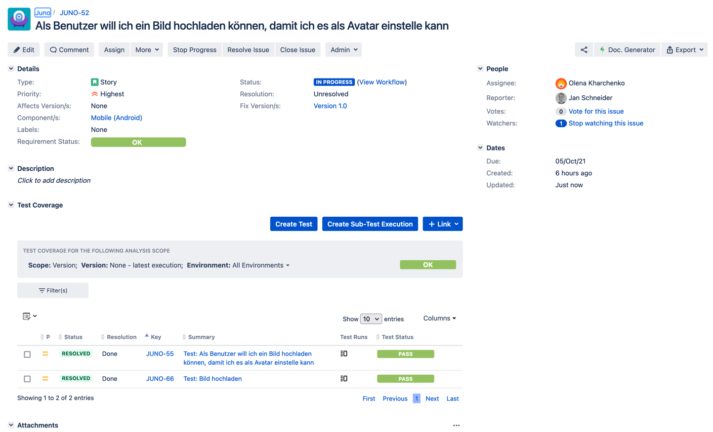 Xray erlaubt es, in Jira-Projekten Test, Test-Sets, Test-Plan, Test Pre-Condition und Test Execution als Vorgänge abzubilden. So ist es jedem Stakeholder möglich, in der gewohnten Jira-Umgebung Testfälle zu formulieren und diese mit User-Storys zu verlinken. Innerhalb des Vorgangs Test kann gewünschtes Verhalten als manueller Testfall formuliert werden oder als generischer Testfall in der Gherkin-Syntax. Unabhängig vom gewählten Format lassen sich die Tests mit einzelnen User-Storys in Jira verbinden. Der Screenshot in Abbildung 2 zeigt eine beispielhafte User-Story, welche mit zwei Tests (ID Juno-55 und Juno-66) verknüpft ist. Beide Tests wurden, erkennbar am Zustand PASS, erfolgreich ausgeführt. So ist die aktuelle Test-Abdeckung einer Story jederzeit ersichtlich.