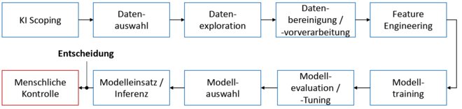 Abb. 1: Typische Entwicklungsphasen einer ML-basierten KI-Lösung. Bei jeder Phase, von der Auswahl der zu lösenden Problemstellungen unter technologischen wie auch wirtschaftlichen Kriterien (sogenanntes KI-Scoping) bis zur Art und Weise der Einbindung des Menschen, stehen maßgebliche Entwicklungsentscheidungen an.