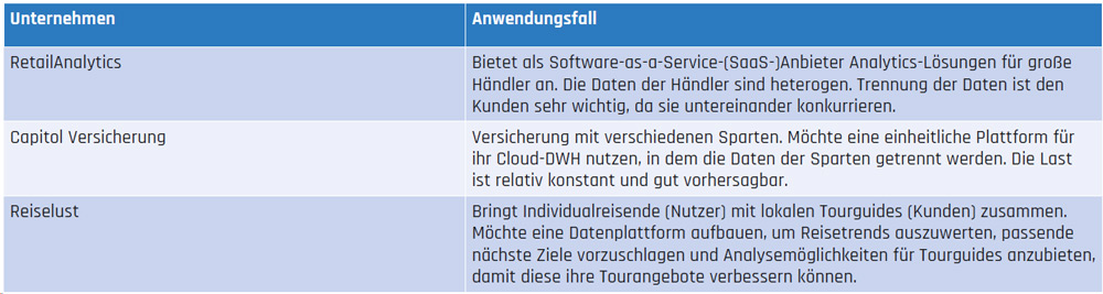Verschiedene Branchenstudien, zum Beispiel von Talend [Tal22] und Qlik [Qli22] nennen Amazon Redshift, Azure Synapse, Google BigQuery und Snowflake als die vier wesentlichen Anbieter in der noch jungen Kategorie der Cloud-DWHs. Basierend auf einer Evaluation für einen Kunden, bei dem Azure als Cloud-Lösung eingesetzt war, werden im Folgenden die zwei dort verfügbaren Cloud-DWH-Lösungen Azure Synapse und Snowflake im Hinblick auf verschiedene Varianten der Mandantentrennung diskutiert. Zur Veranschaulichung dienen drei fiktive Beispielunternehmen, die in Tabelle 1 dargestellt werden.
