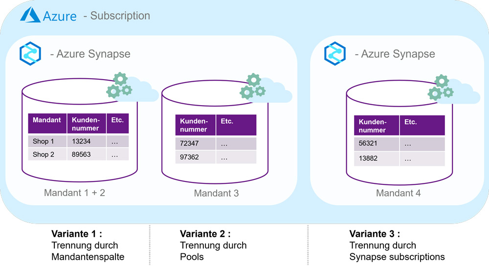 Eine noch stärkere Trennung der Mandanten wird erreicht, indem eine Synapse Subscription (Abbildung 2 rechts) und darin ein SQL-Pool je Mandant eingerichtet werden (Variante 3). Auf dieser Ebene können zusätzlich Netzwerkverbindungen eingeschränkt werden. Die Kosten sind vergleichbar mit der zuvor beschriebenen Trennung nach Pools/Datenbanken. Jedoch lassen sich in Azure viele Features zur Netzwerkisolierung und punktuellen Öffnung (zum Beispiel VNETs und Private Links) ohne große Zusatzkosten nutzen. Bei Snowflake ist für die Nutzung dieser Sicherheitsfunktionen eine höhere Edition (Business-Critical) nötig, die sich auf die gesamten Rechenkosten auswirkt.