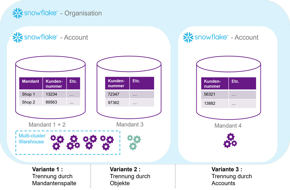 In Snowflake können auf der obersten Hierarchieebene der „Organisation“ verschiedene Mandanten-„Accounts“ angelegt werden, die in sich geschlossene Datenbanksysteme mit eigenen Datenbanken darstellen und eine einfache Verwaltung der maximal getrennten Mandanten (im Sinne von Variante 3) ermöglichen (Abbildung 3 rechts). Da die Rechenleistung keine Grundkosten verursacht, sind die Kosten für diese höchste Variante der Isolation nicht höher als eine Trennung von Objekten pro Mandant mit zusätzlicher Trennung der Rechenleistung durch individuelle virtuelle Warehouses.