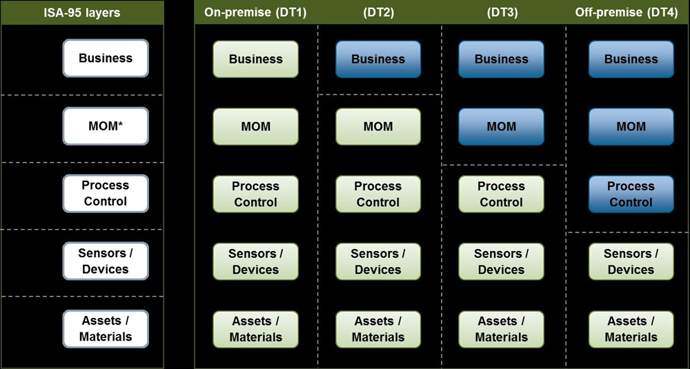 Abbildung 3 zeigt das Kontinuum der Bereitstellungstypen (DT) von Fertigungssoftwaresystemen gemäß der ISA-95-Klassifizierung. Auf der On-premise-Seite befindet sich DT1, wo alle Funktionen an Produktionsstandorten ausgeführt werden. Dieser Bereitstellungstyp ist nur für die Bereitstellung von Diensten vor