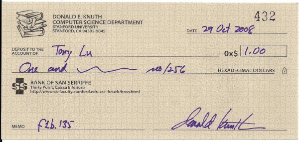 Ja, genau. Man erhält von dieser Bank of San Seriffe für einen entdeckten Fehler einen Scheck und gleichzeitig wird auf der Webseite der Stanford Uni eingetragen, wie viele Dollars man als Guthaben hat. Dabei sind auch die Dollars speziell, denn ein Knuth Dollar sind 256 US Cent. Ein Guthaben von 0x$b40.28 im hexadezimalen System von Knuth Dollar wären also 7373,20 USD.
