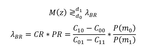 Formel 1: Entscheidungskriterium des Bayesschen Vorhersagemodells und Berechnung des Bayes-Risiko-Schwellenwerts.