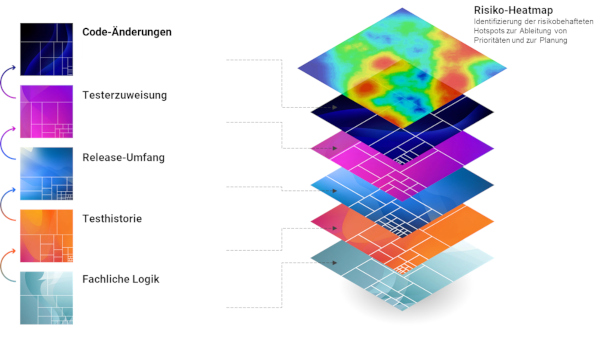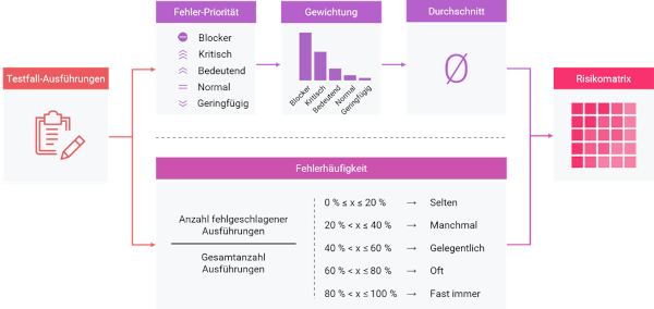 Jedem Testfall wird für jede Ebene automatisiert anhand der zur Verfügung stehenden Daten ein Risikowert zugeordnet. Dafür werden die Zahlen der Fibonacci-Folge verwendet. Einstellige für geringe Risiken, zweistellige für mittlere Risiken und dreistellige für hohe Risiken. Das erlaubt eine ausreichende Nuanciertheit und Vergleichbarkeit der Ebenen untereinander.