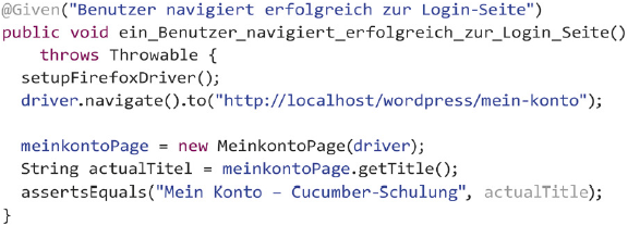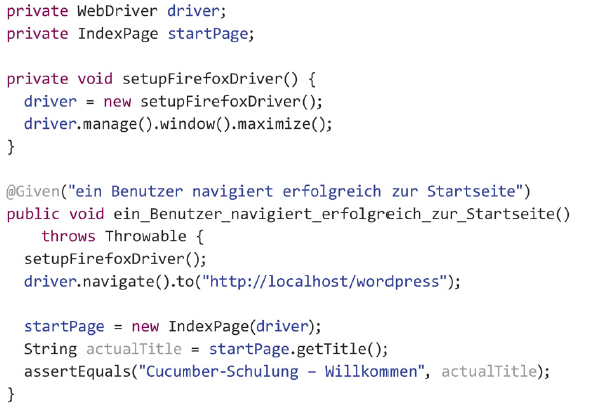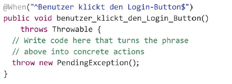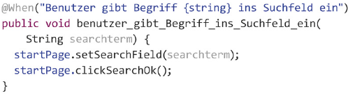 Wie bereits erwähnt, befindet sich in den Stepfiles der ausführbare Testcode, passend zu den vorher definierten Schritten im Featurefile. Cucumber verwendet hier Annotationen, um Methoden auf die entsprechenden Schritte zu mappen. Konkret sieht dies wie in Listing 1 aus.