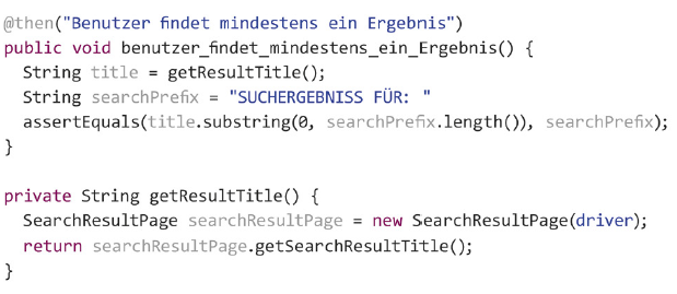 In den Abschnitten zuvor wurden bereits der BDD-Aspekt und die zugehörige Featurebeschreibung erläutert, doch wie sieht nun der vollständige Code zum vorherigen Beispiel mit der Suchfunktion unseres Shops aus? Der Einfachheit halber wurden einige Funktionen zusammengefasst, die sonst in unterschiedliche Unterfunktionen ausgelagert worden wären.
