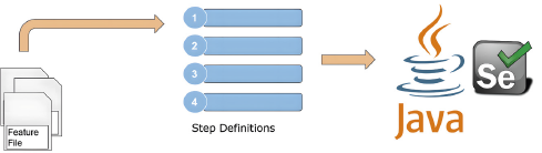 Abb.1: Cucumber-Prozess. FeatureFiles rufen Step-Definitionen auf, die den Testcode beinhalten