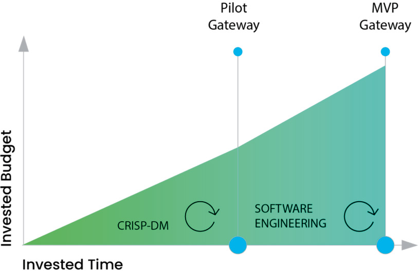 In der ersten Phase ist es essenziell, dass Data Scientists im Sinne eines Requirement Engineering agieren und mit den Fachbereichen die fachlichen Anforderungen an die ML-Lösung erarbeiten. So lassen sich früh die Erwartungen an den Nutzen des Projekts erheben. Es geht darum, potenzielle Anwendungsfälle für Machine Learning zu identifizieren, das Business-Problem zu verstehen und zu überprüfen, wie die bestehenden Daten dieses Problem widerspiegeln. Mit Prototypen und PoCs lassen sich mögliche Lösungen testen und validieren. Diese Pilotphase sollte nicht zu lange laufen oder im Konzeptionellen verharren. Die Machbarkeit eines Datenprodukts muss engmaschig und in der minimal möglichen Zeit bewertet werden. Die gemeinsam erarbeiteten Erwartungen sowie die Ergebnisse der PoCs bilden eine wichtige Entscheidungsgrundlage, ob es Sinn ergibt, auch ein MVP zu entwickeln.