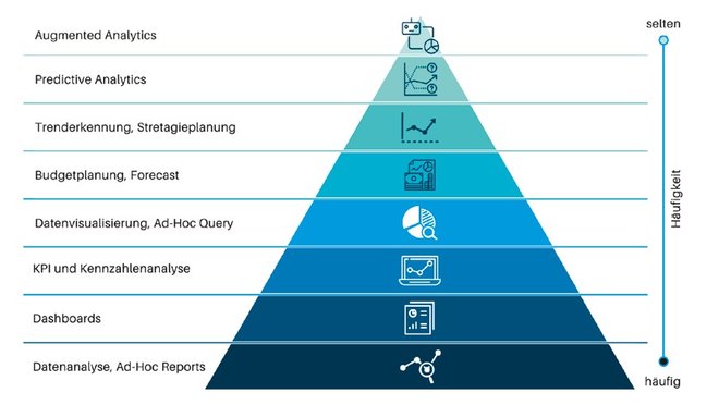 Die noch eher selten anzutreffenden Augmented-Analytics-Features stehen an der Spitze der Pyramide. Sie stellen eine deutliche Weiterentwicklung der bisherigen Möglichkeiten dar. Und das Wichtigste: Sie bieten Fachbereichsmitarbeitern einen enormen Mehrwert und stellen ihnen erstmals Lösungen zu vielen Analyse-Herausforderungen zur Verfügung, die sie mit klassischen BI-Funktionalitäten nicht in den Griff bekommen.