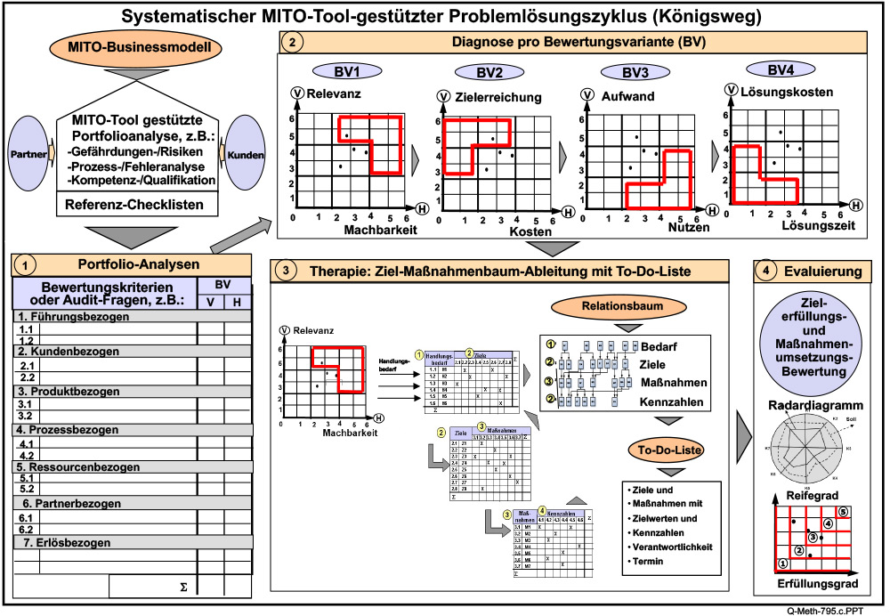 Zu den einzelnen sieben Fragestellungen mit den dahinterstehenden Gestaltungsinhalten innerhalb der MITO-Businessmodell-Segmente gibt es MITO-Referenzportfolio-Checklisten, die einen zielführenden Problemlösungszyklus mit den Phasen:
