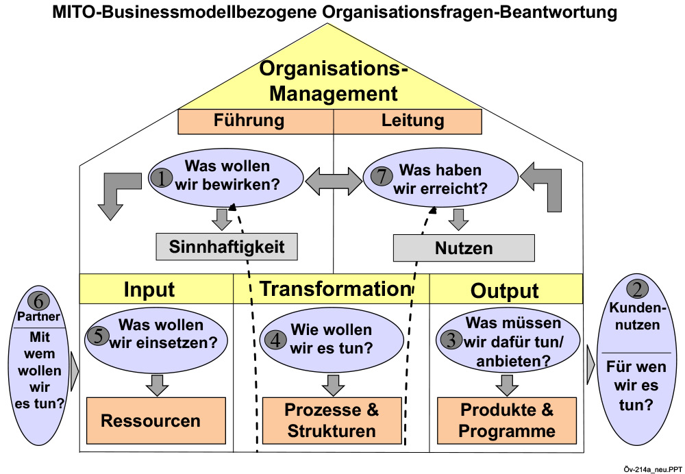 Der Bezug- und Ordnungsrahmen für eine ganzheitliche Organisationsgestaltung mit dem MITO-Methoden-Tool ist das MITO-Businessmodell, das über die systematische Beantwortung der 7W-Grundfragen die zu schaffenden Strukturen für eine prozessorientierte Organisation vorgibt. Geschäftsmodelle als strategische Führungsinstrumente ermöglichen dem Management agile Anpassungen an stattfindende unternehmensrelevante Veränderungen, zum Beispiel in Bezug auf Märkte, Kunden, Produkte, Prozesse, Technologien, Informationen, Gesetze, Kulturen und weitere. Das unternehmensspezifische Geschäfts- beziehungsweise Businessmodell beschreibt den Zusammenhang von Unternehmenszweck und Marktsegment, Schlüsselkunden, Schlüsselprodukten, Schlüsselprozessen, Schlüsselressourcen, Schlüsselpartnern und den dadurch erlösten Wert. Diese sieben Elemente werden im MITO-Businessmodell in Form eines integrierten Unternehmens- und Betriebsregelkreises abgebildet.