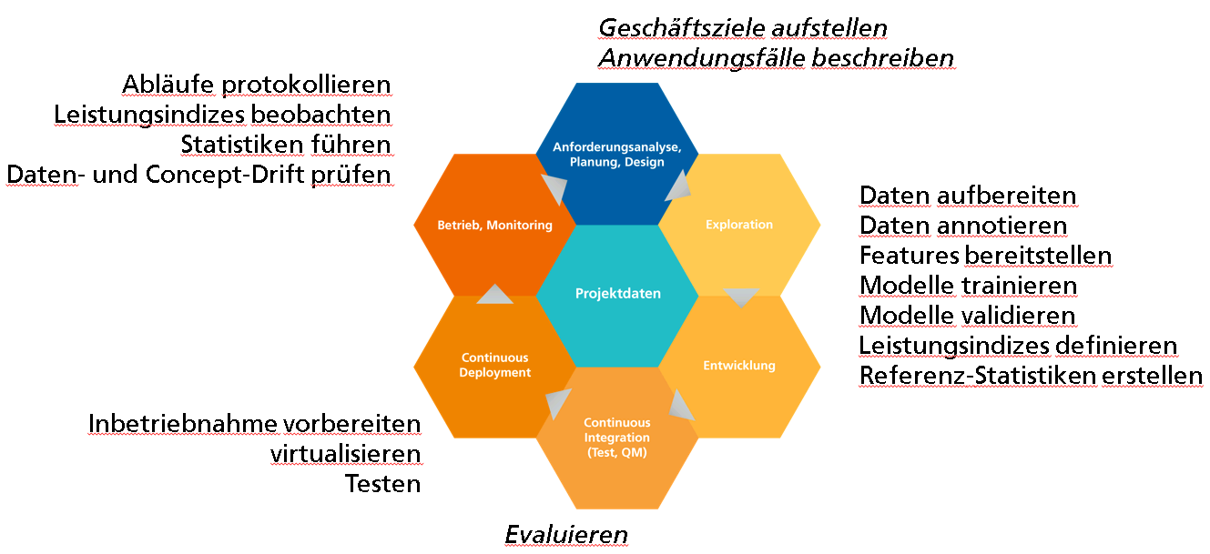 MLOps (Machine Learning Operations) wird als Erweiterung von DevOps (Development and Operations) verstanden. Das Ziel von DevOps ist es, den Entwicklungszyklus von Software zu verkürzen und qualitativ hochwertige Softwareartefakte schnell in die Produktion zu bringen. Dabei ist ein Team sowohl für die Entwicklung als auch für den Betrieb eines Produkts verantwortlich. Arbeitsabläufe und Verfahren werden so weit als möglich automatisiert. Ausgehend vom DevOps-Zyklus integriert der MLOps-Ansatz die Arbeitsphasen von ML-Projekten, so wie sie im grundlegenden CRISP-DM-Modell (CRoss Industry Standard Process for Data Mining) systematisiert wurden.
