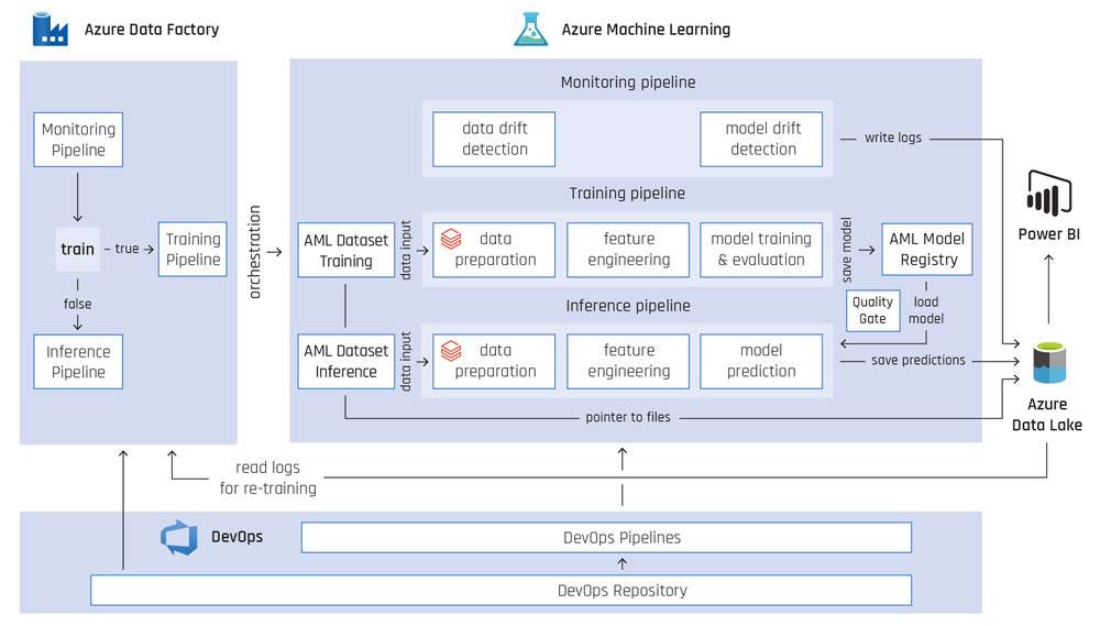 Das ML-System wird komplettiert, indem die AML-Pipelines über die Azure Data Factory orchestriert werden. Die ML-Pipelines werden in regelmäßigen Abständen getriggert, um neue Vorhersagen bereitzustellen und, wenn nötig, ein neues Modell zu trainieren. Dabei hängt das Retraining davon ab, ob ein Data oder Model Drift festgestellt wird [McK20]. Ist dem so, wird mit der Trainings-Pipeline ein neues Modell trainiert und in der Registry abgelegt.