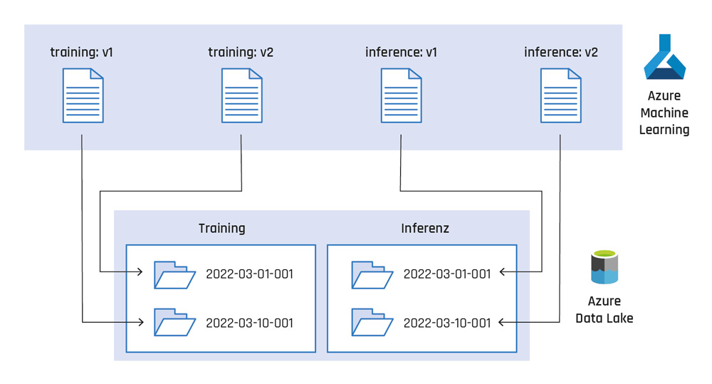 Mit dem Managen von Daten ist das Versionieren von Input-Daten gemeint, die für das Training des ML-Modells verwendet werden. Im Azure Data Lake liegen sowohl Trainings- als auch Inferenz-Datensätze, die in der Rohform von externen Systemen dort bereitgestellt werden. Um eine Historie aufzubauen, werden Zeitstempel verwendet, die Partitionen beziehungsweise Unterordner im Azure Data Lake darstellen und jeweils vollständige Datensätze für das Training und die Inferenz zu einem Zeitpunkt repräsentieren. Im AML-Arbeitsbereich zeigen die registrierten Datensätze auf einen eindeutigen Ordner im Data Lake. Dieser Ordner wird nachträglich nicht mehr modifiziert. Sollten Daten im Data Lake aktualisiert werden, wird ein neuer Datensatz registriert, der auf diese aktuelle Version verweist (siehe Abbildung 3).