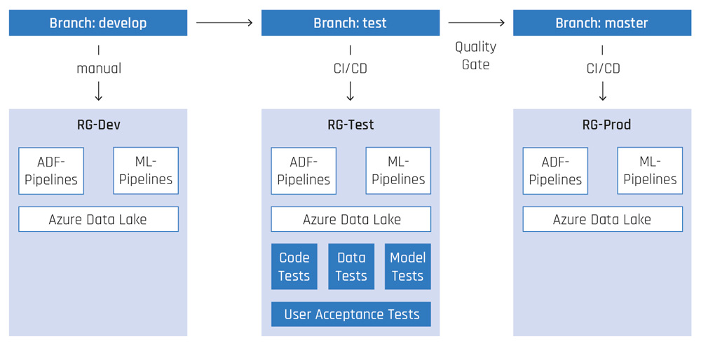 Wie in einem klassischen Softwaresystem wird auch hier jede Änderung am ML-System automatisiert deployed und getestet, bevor sie ins Produktivsystem übernommen wird. Abbildung 4 stellt den implementierten Deployment-Prozess schematisch dar. Dafür werden die Azure-DevOps-Services Repos und Pipelines eingesetzt. In unserem Fallbeispiel werden drei Umgebungen verwendet, repräsentiert durch die drei Ressourcengruppen RG-Dev, RG-Test und RG-Prod. Diese enthalten jeweils die für das ML-System notwendigen Haupt-Services Azure Data Factory (ADF), Azure Machine Learning und Azure Data Lake.