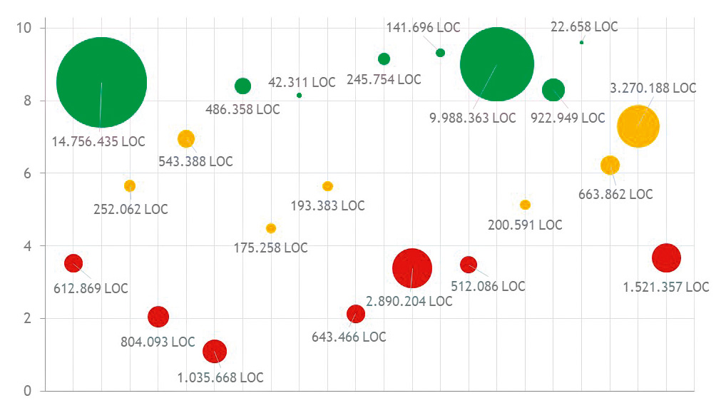 Um für Softwaresysteme eine Bewertungsmöglichkeit zu schaffen, haben wir in den vergangenen Jahren den Modularity Maturity Index (MMI) entwickelt. In Abbildung 2 ist eine Auswahl von 21 Softwaresystemen dargestellt, die in einem Zeitraum von fünf Jahren analysiert wurden (jedes System hat auf der X-Achse eine Einheit). Für jedes System ist die Größe in Lines of Code dargestellt (Größe des Punktes) und die Modularität auf einer Skala von 0 bis 10 (Y-Achse). Die Farbgebung Rot, Gelb und Grün entspricht dabei den jeweiligen Bereichen der technischen Schulden aus Abbildung 1.