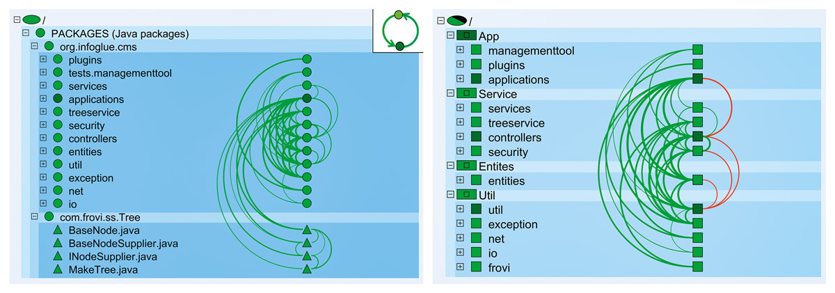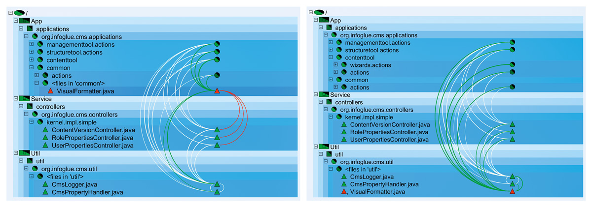 Die Verletzung zwischen den Schichten „Service“ und „App“ werden uns hier als ein Beispiel dienen, wie Verletzungen refaktoriert werden können. In Abbildung 5 zeigen sowohl die linke als auch die rechte Seite eine gefilterte Sicht auf den Quellcode. Links sieht man drei Klassen aus dem Package „org.infoglue.cms.controllers.kernel.impl.simple”, die die Verletzung zwischen „controllers“ und „applications“ (roter Bogen) verursachen. Diese drei Klassen rufen eine Methode aus der Klasse VisualFormatter.java. Die Beziehungen, die von den drei Controller-Klassen ausgehen, entstehen durch eine einzige Zeile:
