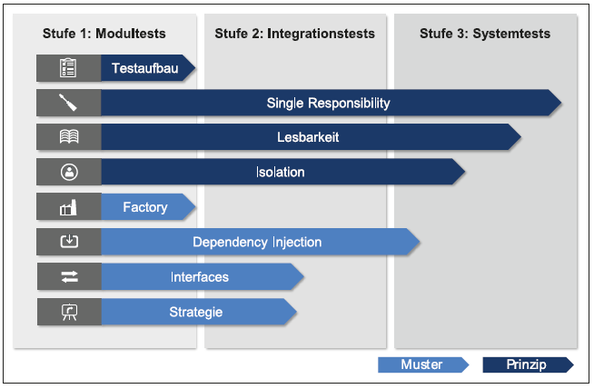 Vor diesem Hintergrund werden im Folgenden Entwurfsmuster und Designprinzipien vorgestellt, die eine gute Testbarkeit ermöglichen. In Abbildung 2 sind die verschiedenen Muster und Prinzipien und ihr Einfluss auf die Teststufen (Modul-, Integrations- und Systemtest) dargestellt.