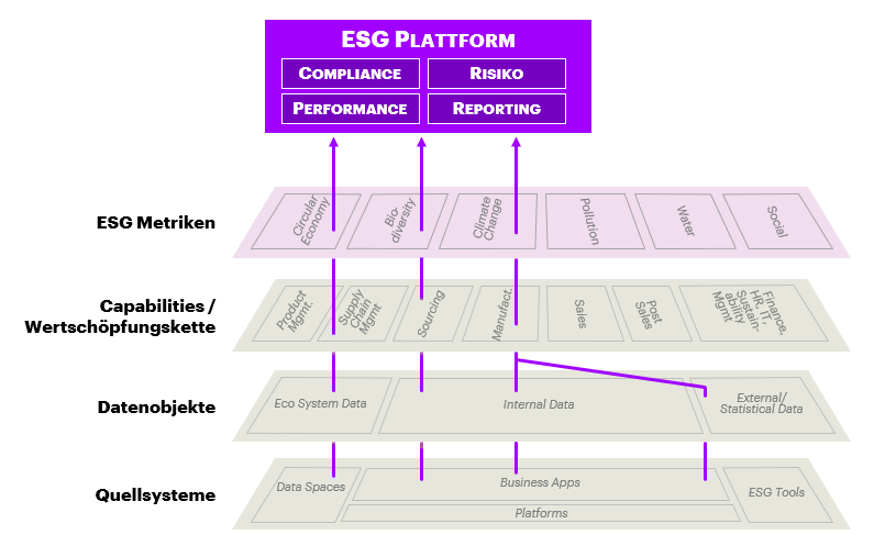 Abb. 1: Mittels einer strukturierten Enterprise-Architektur kann Transparenz geschaffen werden, wie das ESG-Reporting (Environmental, Social and Governance) aggregiert wird