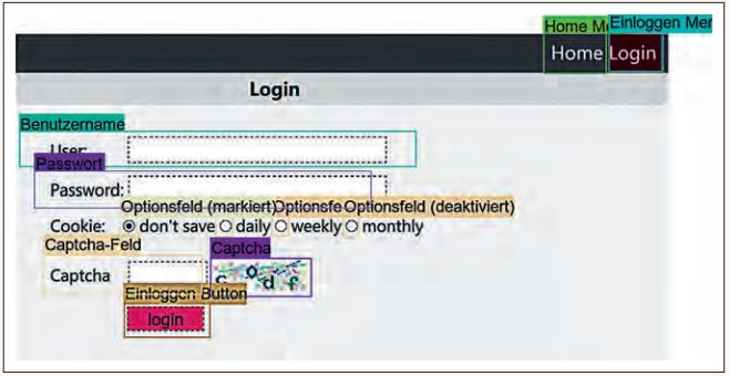 Abbildung 2 zeigt wieder die Login-Maske des Mockups. Ein bereits trainiertes CNN kann alle Objekte der Maske korrekt zuordnen. Eingabefelder, Optionsfelder, Aktionsund Menüflächen wurden richtig erkannt und zugeordnet. Das so erstellte CNN wird als Modell bezeichnet. Jedes Farbfeld mit seinem Namen repräsentiert das Ergebnis des