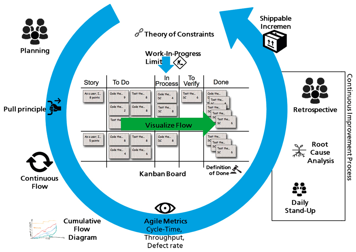 Das Herzstück von Kanban ist das sogenannte Kanban-Board zur Visualisierung des aktuellen Status der Aufgaben über verschiedene Spalten (in der simpelsten Form: „ToDo“, „In Arbeit“, „Fertig“). Neben dem Board gibt es noch viele weitere agile Bausteine, die erst in der Summe die gesamte Methode Kanban ergeben. Diese sind: das Work-in-Progress-Limit (WiP), das Pull-Prinzip, ein regelmäßiges Planungs-Meeting, das Daily, die Definition of Done (DoD), das Kumulative Flussdiagramm und gegebenenfalls weitere Diagramme und die Retrospektive. Mehr Details zu Kanban finden sich in [And11]. In unserem „persönlichen“ Szenario wäre das reine Kanban-Board zu kurz gedacht, denn Arbeitsorganisation und Zeitmanagement bedürfen mehr als der reinen Transparenz über Visualisierung. Wichtig ist hier speziell der kontinuierliche Verbesserungsprozess (KVP oder Kaizen, aus dem Japanischen). Aus diesem Grund dient Kanban als Methode unserem „persönlichen“ Szenario als Grundlage und wurde dafür noch ein wenig angepasst und vereinfacht.