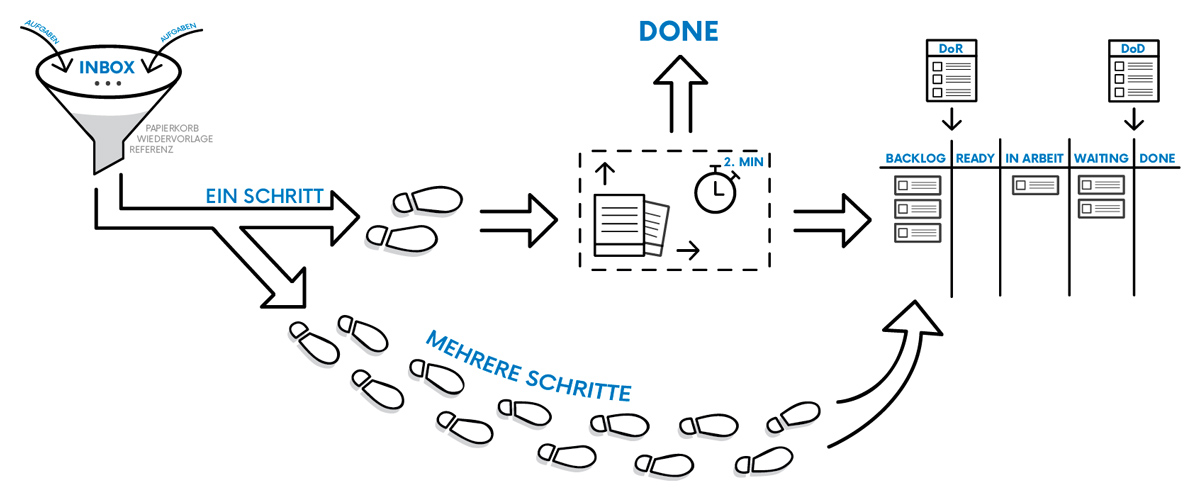 Die Lösung hierfür ist eine Kombination aus einem angepassten Kanban und der Idee beziehungsweise dem Ablauf von „Getting Things Done“ [All19]. Diese Kombination dient speziell dazu, das Befüllen des Kanban-Systems zu vereinfachen und zu systematisieren. Die Übersicht in Abbildung 2 zeigt den Weg von der „Inbox“ bis hin zum Backlog des Kanban-Boards. Generell ist die Lösung komplett unabhängig von der Tool-Nutzung. An der einen oder anderen Stelle werden jedoch Tools aus der Praxis als Beispiele erwähnt