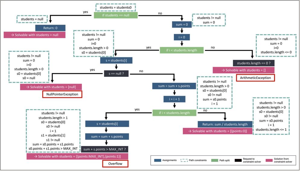 Mit Symbolischer Ausführung können wir ermitteln, mit welchen Werten für die Variable students die Pfade der Methode erreicht werden können und ob dabei Probleme auftreten können. Abbildung 1 veranschaulicht, wie die Programmpfade mit Symbolischer Ausführung berechnet werden.