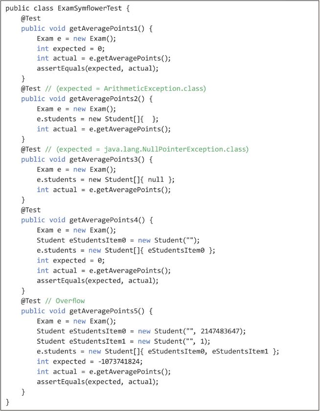 Damit wurden alle Zeilen der Methode abgedeckt, allerdings noch nicht ein möglicher Überlauf bei der Addition. Die Schleife wird daher weiter ausgeführt, die Variable s wird auf das zweite Element gesetzt und die Addition erneut durchgeführt. Der Solver findet in dieser Konstellation eine Lösung, die einen Überlauf verursacht: Mit diesen Werten wird ein weiterer Testfall getAverage-Points5() generiert.