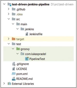 Für Groovy-Neulinge stellt sich schließlich noch die Frage nach der geeigneten Dateiund Ordnerstruktur im Projekt (siehe Abbildung 3). Die Bibliothek Jenkins-Pipeline-Unit erwartet die Pipelineskripte von Jenkins per Konvention im Verzeichnis src/main/jenkins.