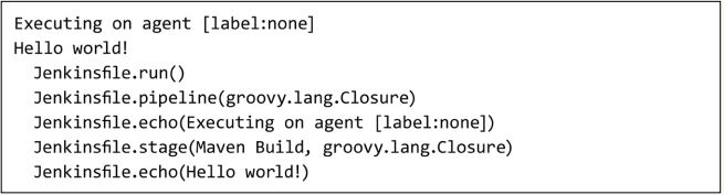 Nun muss daher im zweiten Schritt des testgetriebenen Entwicklungszyklus das Jenkinsfile mit einer minimalen Jenkins-Pipeline gefüllt werden, die den Test erfolgreich durchlaufen lässt (Listing 3). Ein syntaktisch valides, minimales Jenkinsfile enthält mindestens eine Stage mit mindestens einem Befehl. In diesem Fall geben wir einfach auf der Jenkins-Konsole „Hello world!“ aus. Bei Ausführung des Tests ist dieser nun tatsächlich erfolgreich und der erwartungsgemäße Jenkins-Stacktrace wird in der Konsole geloggt (Listing 4).