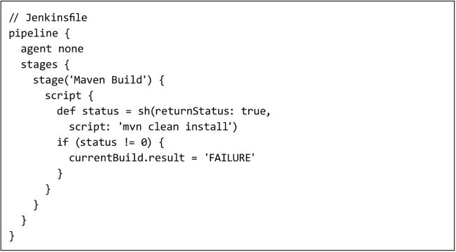 Mit der Anpassung des Produktivcodes laufen die Unit-Tests nun erfolgreich durch. Im dritten Schritt, dem Refactoring, wäre es nun denkbar, das Ergebnis der Pipeline explizit zu machen, indem wie im ersten Beispiel über assertJob StatusSuccess() beziehungsweise über assertJobStatusFailure() das Ergebnis geprüft wird (Listing 7). Die Pipeline setzt das Ergebnis dann explizit auf „Failure“, wenn der Shellbefehl mit dem Aufruf von Maven nicht erfolgreich ist (Listing 8).