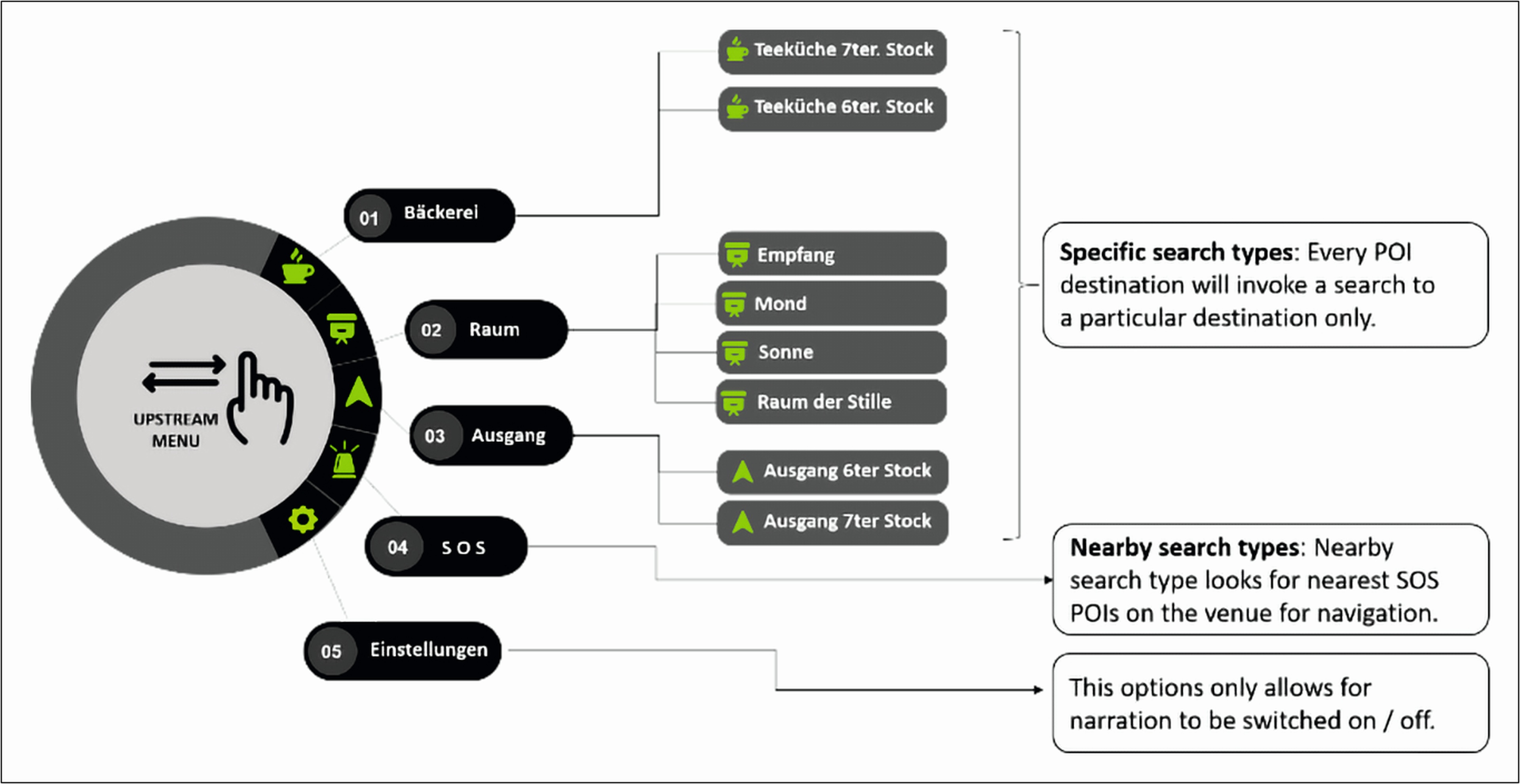 Aus früheren Projekten wissen wir, wie wichtig eine klare Menü-Struktur, welche den Nutzer sowohl akustisch (Sprachbefehle) als auch visuell (Ansicht in Smart Glass) durch die Anwendung leitet, für die Nutzer-Akzeptanz ist. Darum legten wir ein Hauptaugenmerk darauf. Unsere Menüstruktur zeigt Abbildung 2.