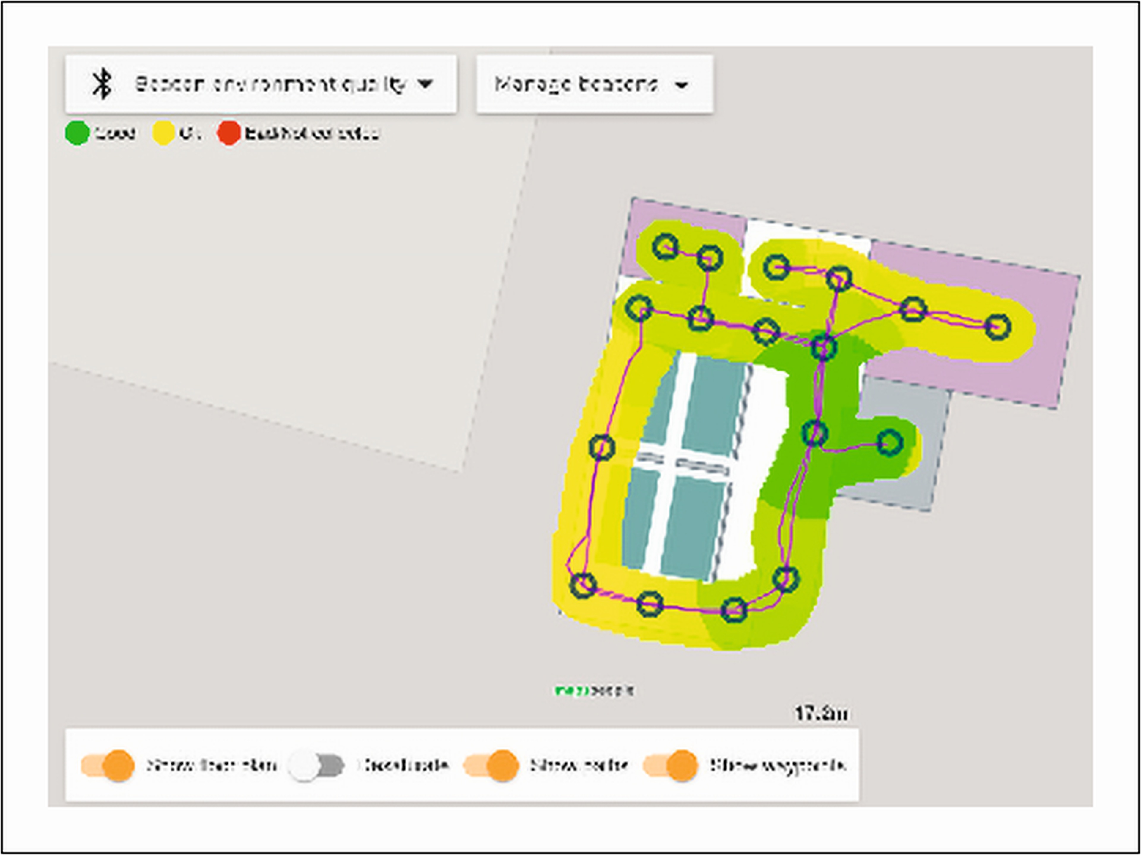 - Beacon Coverage: Mittels der App eines weiteren Partners wurde die Abdeckung der montierten Beacons aufgezeichnet – eine der wesentlichsten Voraussetzungen für eine funktionstüchtige Navigation (siehe Abbildung 4).