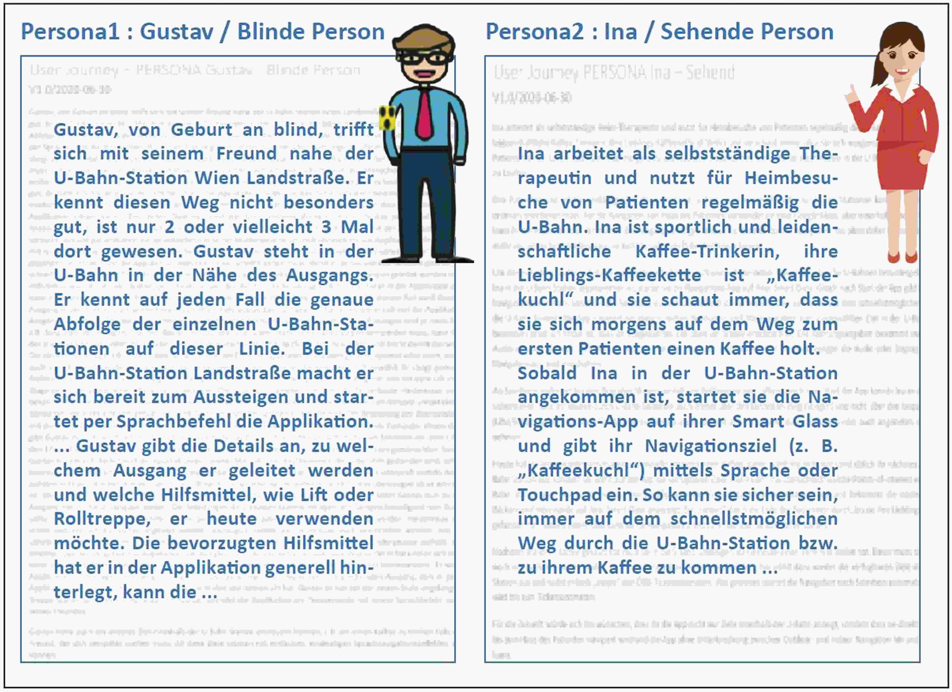Neben einer technischen Evaluierung galt es aber vor allem, gewünschte Funktionalitäten für unsere Zielgruppe zu konkretisieren. Welche Bedürfnisse, Wünsche und vor allem reale Hilfen könnten hier wirklich Erleichterung bringen? Unser Ansatz: Wir definierten Personas inklusive User-Journeys.