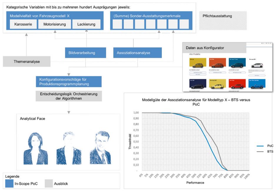 Die intelligente Auswertung von Social-Media- und Online-Quellen (zum Beispiel Auto-Konfiguratoren) sowie die Auswertung vergangener Kaufmuster aus den internen Datenbeständen der Automobilhersteller ermöglicht es, ein analytisches Abbild des Kaufverhaltens der Kunden abzuleiten. In Abbildung 1 wird der grobe fachliche Rahmen, die Vorgehensweise und die Datengrundlage für den vorliegenden PoC vorgestellt. Aufgrund der zeitlichen Vorgabe für die Durchführung des PoC wurde ein Teilausschnitt von relevanten Daten und geeigneten Algorithmen verwendet, die in Abbildung 1 blau hinterlegt dargestellt sind. Die grau hinterlegten Flächen geben einen Ausblick auf weitere Datenquellen und Algorithmen, um den vorliegenden Lösungsansatz auszubauen (zum Beispiel Anwendung von Operations-Research-Modellen).