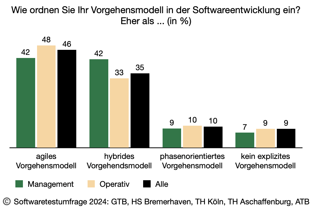 Agile Vorgehensmodelle sind weiterhin die bevorzugte Methode in der Softwareentwicklung. So geben die meisten Teilnehmenden an, ein agiles Vorgehensmodell zu verwenden (Management: 42 %, operativ Tätige: 48 %). Es gibt zudem eine weitere Tendenz zur Kombination agiler und traditioneller Elemente, denn 42 Prozent der Teilnehmenden aus dem Management geben an, ein hybrides Vorgehensmodell zu nutzen. Hybrid selbst ist nur bedingt definiert und so fällt auf, dass nur 33 Prozent der operativ Tätigen ihre Projekte als hybrid ansehen. Hier scheint eine deutliche Wahrnehmungs- oder Begriffsdiskrepanz zwischen Management und operativ Tätigen vorzuliegen.