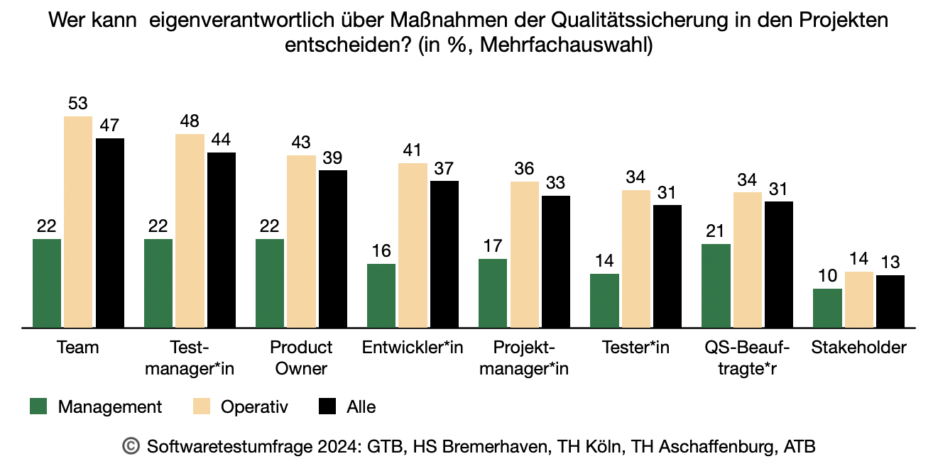 Eine noch deutlichere Diskrepanz zwischen den beiden befragten Gruppen zeigt sich bei der Frage, wer in einem Projekt eigenverantwortlich über Maßnahmen der Qualitätssicherung entscheiden kann. Während die operativ Tätigen hier einen klaren Schwerpunkt mit 53 Prozent auf das Team legen, sehen nur 22 Prozent aus dem Management dort diese Entscheidungskompetenz. Beide Gruppen zeigen allerdings auch noch eindeutige Altlasten älterer Vorgehensmodelle: So entscheiden laut Angaben aller Teilnehmenden häufig die Projektmanager:innen (33 %), die QS-Beauftragten (32 %) oder sogar ganz allgemein die Stakeholder (13 %) über die Maßnahmen der Qualitätssicherung. Diesen Antworten steht das Paradigma der Selbstorganisation agiler Teams entgegen, was den hohen Anteil hybrider Ansätze zu erklären scheint.