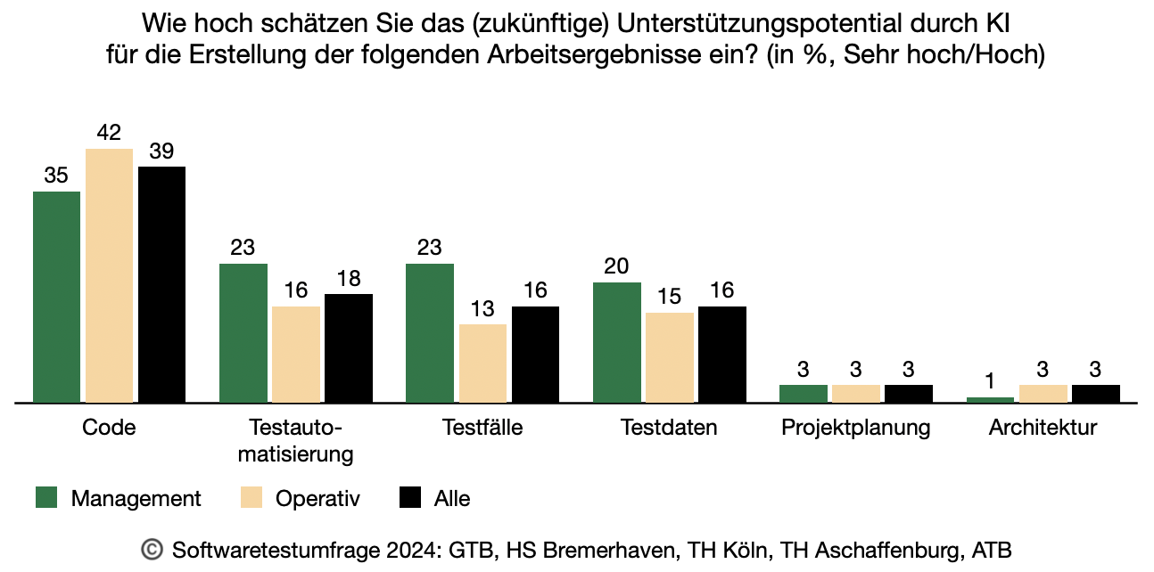 Die Delegation wird für diese Tätigkeiten der KI übertragen. So geben bereits heute 35 Prozent der Teilnehmenden aus dem Management an, dass KI bei der Codierung verwendet wird. Dass diese Frage von 42 Prozent der operativ Tätigen im Bereich des Codierens positiv beantwortet wird, zeigt, dass nicht jede KI-Nutzung bei der Codierung im Management bekannt zu sein scheint. Auf der anderen Seite sieht das Management mehr KI im Einsatz, als dies die operativ Tätigen sehen: so im Bereich der Testautomatisierung (23 % vs. 16 %), der Testdaten (20 % vs. 15 %) und der Testfälle (23 % vs. 13 %).