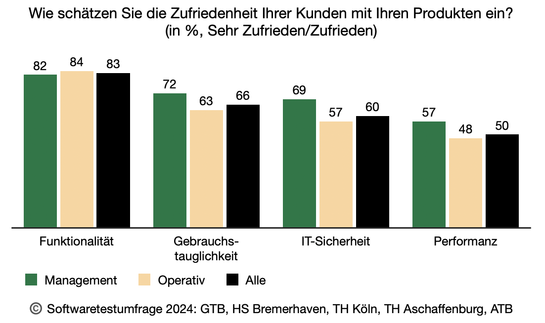 Alle Teilnehmenden bestätigen, dass die Kunden mit der Funktionalität zufrieden sind (mehr als 81 %). Auch die Effektivität des Testens erhält für die Funktionalitätstests Bestnoten: Mehr als 82 Prozent aller Befragten bewerten diese mit hoch oder sogar sehr hoch. Schlusslicht ist hier die Performanz: Nur 49 Prozent des Managements und sogar nur 30 Prozent der operativ Tätigen schätzen die Effektivität der Last- und Performanztests als hoch oder sehr hoch ein. Im Bereich der IT-Sicherheitstests sieht die Einschätzung nicht besser aus. Auch hier wird der Status quo im Kreise der operativ Tätigen deutlich negativer (nur 31 % hoch oder sehr hoch) eingeschätzt, als vom Management (48 %). Diese Qualitätskriterien sind dann auch genau diejenigen, die entlang der Analyseergebnisse beim Kunden laut aller Teilnehmenden seltener mit zufrieden angegeben werden: IT-Sicherheit: 60 Prozent, Performanz: 50 Prozent. Hier muss die Testeffektivität in den nächsten Jahre noch gesteigert werden, um die Kunden auch bei diesen Qualitätskriterien zu überzeugen.