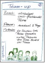 In der Bank nahmen wir an, dass sechs Wochen ausreichend sein müssten, um selbst stark überlasteten Bereichen ausreichend Vorlauf und Handlungsspielraum zu geben, wenn etwa zwei zentral benötigte Experten für vier Wochen im Lab verschwinden. Die Team-up-Phase ist dafür da, alle Vorbereitungen zu treffen, damit das nächste Lab beginnen kann (Abb. 3).