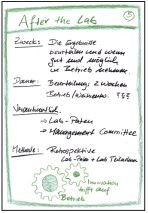 Gleichzeitig dient dieser Termin als Retrospektive für das vergangene Lab im Kernteam, also ohne die Teilnehmer des Labs. Ziel dieses Termins sowie der gesamten Arbeit des Kernteams ist es, den Lab-Prozess im Unternehmen ständig zu verbessern und am Leben zu halten.