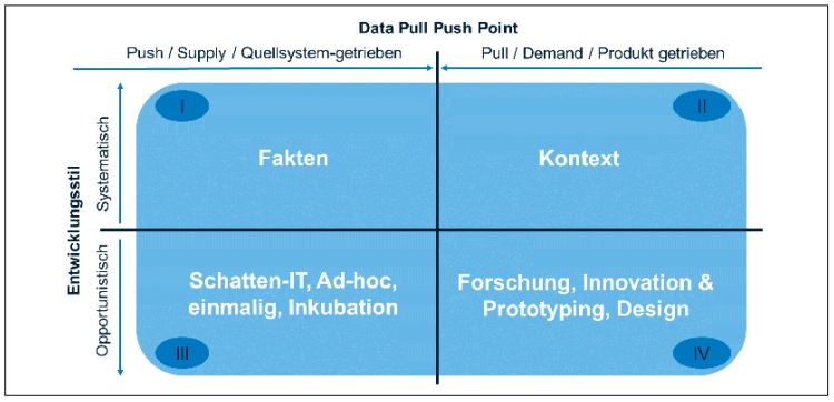 Damhof zieht auf der x-Achse die aus der Betriebswirtschaftslehre bekannten Begriffe der Push- oder Pull-Strategie heran. Gemeint ist damit, wie stark der Produktionsprozess durch die Nachfrage gesteuert und individualisiert wird. Auf der rechten beziehungsweise Pull-Seite werden auf Basis ganz konkreter Fachanforderungen zum Beispiel themenspezifische Datamarts und darauf aufbauend Informationsprodukte wie Reports und Dashboards entwickelt. Hier stehen Agilität und Fachwissen im Zentrum. Die ersten beiden Größen S und M können auf dieser Seite verordnet werden.