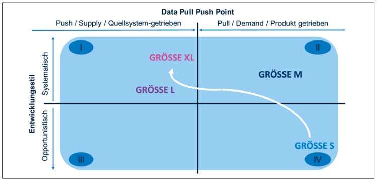 Auf der anderen (linken beziehungsweise Push-) Seite stellt zum Beispiel die BI-Abteilung die Anbindung verschiedener Quellsysteme zur Verfügung und bereitet die Daten in einem Data Warehouse auf. Der Fokus liegt auf Skaleneffekten und dem Bereitstellen einer stabilen Grundinfrastruktur für BI im Unternehmen. Hier können wir die beiden anderen Größen L und XL verorten.