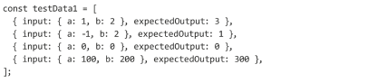In beiden Beispielen haben wir Testdaten erstellt, die verschiedene Eingabewerte für die Funktion addNumbers enthalten, zusammen mit den erwarteten Ausgabewerten. Diese Testdaten können dann in Unittests verwendet werden, um die korrekte Funktionsweise der Funktion zu überprüfen.